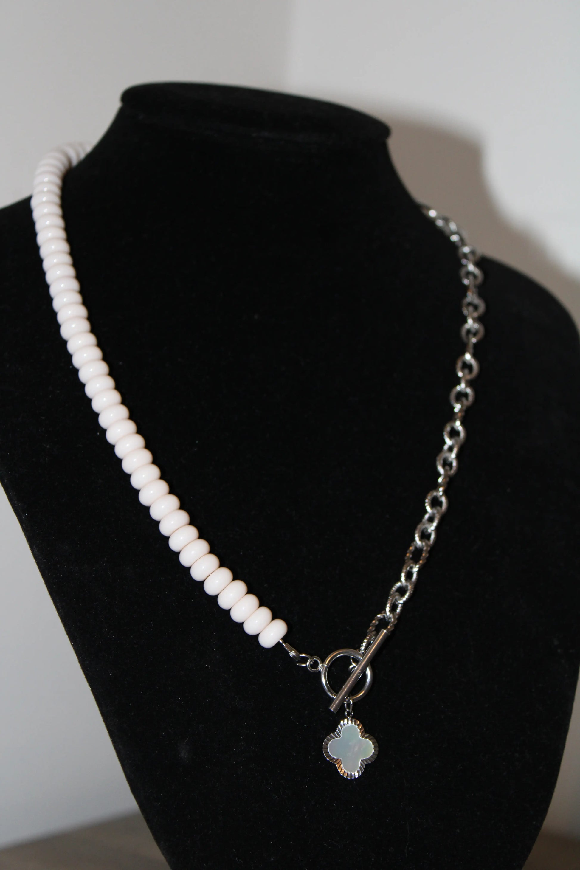 Ce bijou est composé une moitié en perles de verres nude, et une moitié en chaîne acier inoxydable. Le pendentif trèfle est également en acier inoxydable ; assurant la durabilité et solidité du collier.